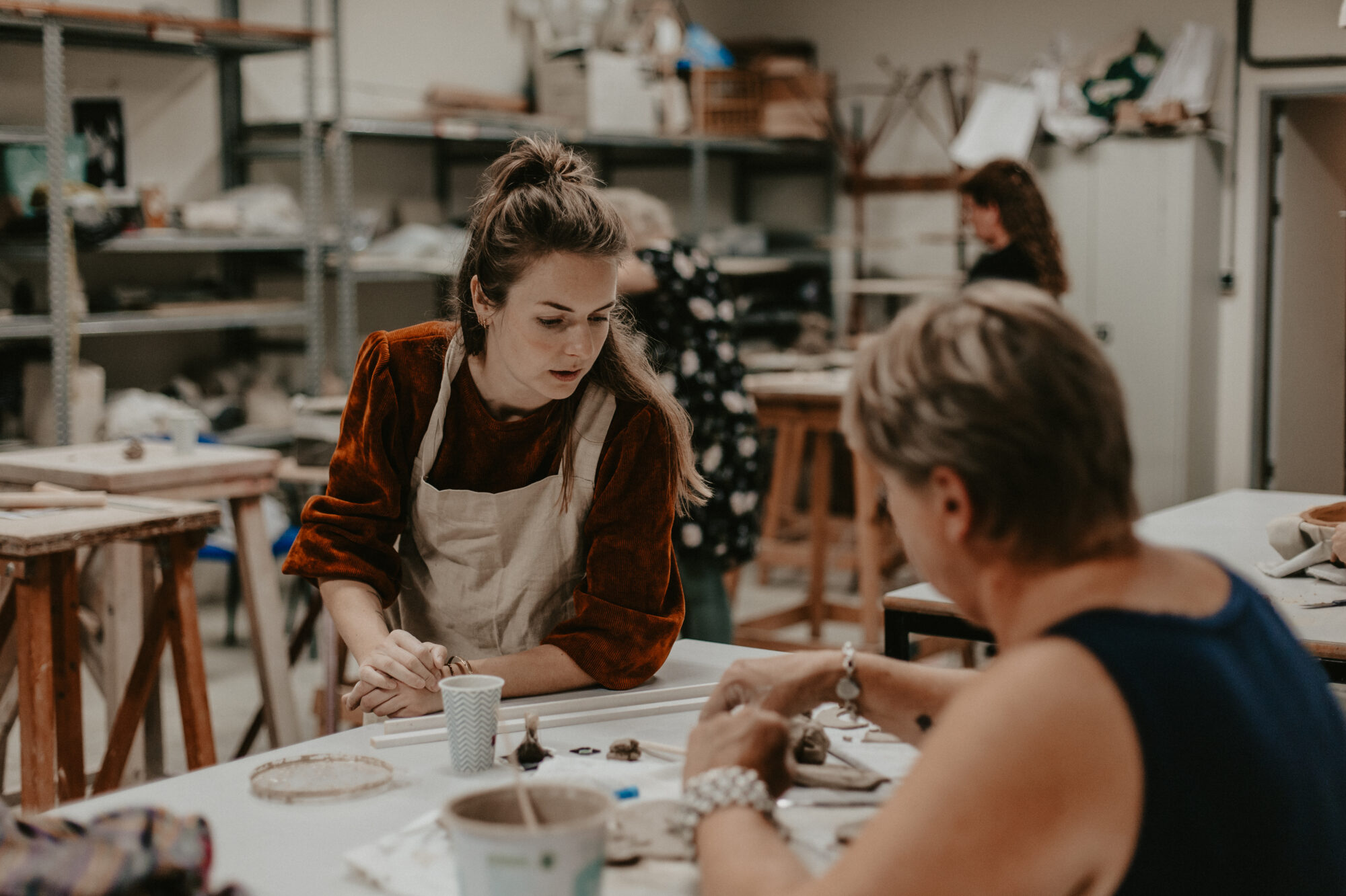 In ons atelier kun je cursussen pottendraaien en boetseren volgen. Elke maand organiseren we wisselende workshops waarbij je dieper duikt in bijzondere keramiek-technieken. Het kinderatelier is de plek voor jonge makers om kennis te maken met klei. Voor de meer gevorderde makers is er het Open Atelier, je eigen plek in de stad waar je zelfstandig werkt aan jouw projecten. Voor groepen zoals personeelsuitjes of vrijgezellenfeesten bieden we laagdrempelige en gezellige workshops aan.